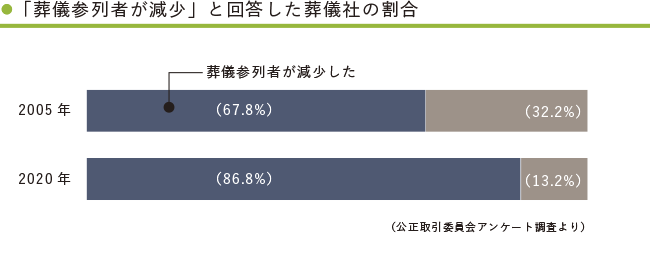 葬儀参列者が減りつつあることは、今から20年前の2005年の調査でも、回答した葬儀社の2/3を占めており、2020年にはおよそ9割近くになっています(下図)。
