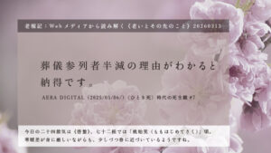 AERA 電子版の記事は昨年2025年のものですが、今日の変化した葬儀のカタチを端的に捉えた内容になっています。記事は死生学研究の第一人者でもあるシニア生活文化研究所代表理事の小谷みどりさんが、現代社会の「死」の捉え方を浮き彫りにした書籍《朝日選書『〈ひとり死〉時代の死生観』(朝日新聞出版)》を要約したもので、特に葬儀参列者の減少について、その理由を深掘りした内容になっています。